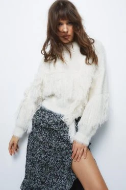 Talking texture. Cozy up as the cold weather draws in in our premium high neck fringe sweater.