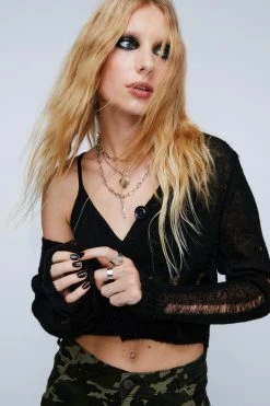Button it. Feel confident in our cropped cardigan, made in high quality sheer fabric, with eye catching laddered detailing, and a button fastening. Pairs well with mini skirts and leather pants for an elevated look that will take you seamlessly from day to night, perfect for hitting up happy hour, layering up in the office, and heading for drinks.