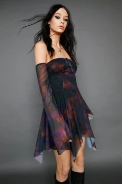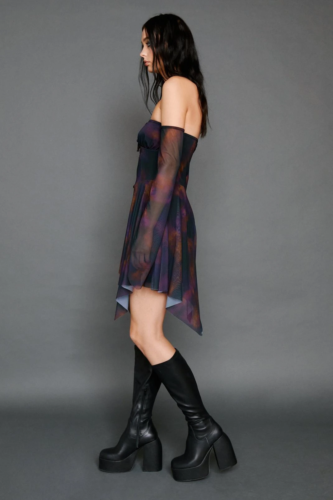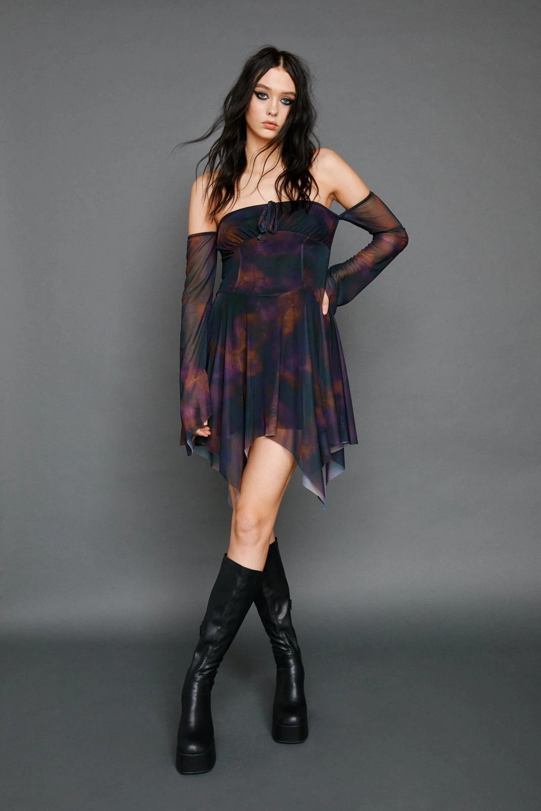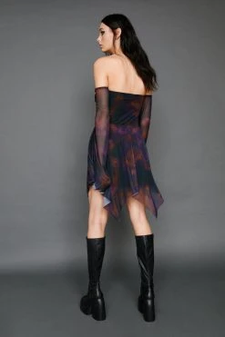 Dress it up. Feel edgy in our long sleeve dress, with a sheer mesh fabric, asymmetric hemline, and a bardot neckline. Pairs well with boots or chunky heels for a look that will take you seamlessly from day to night.