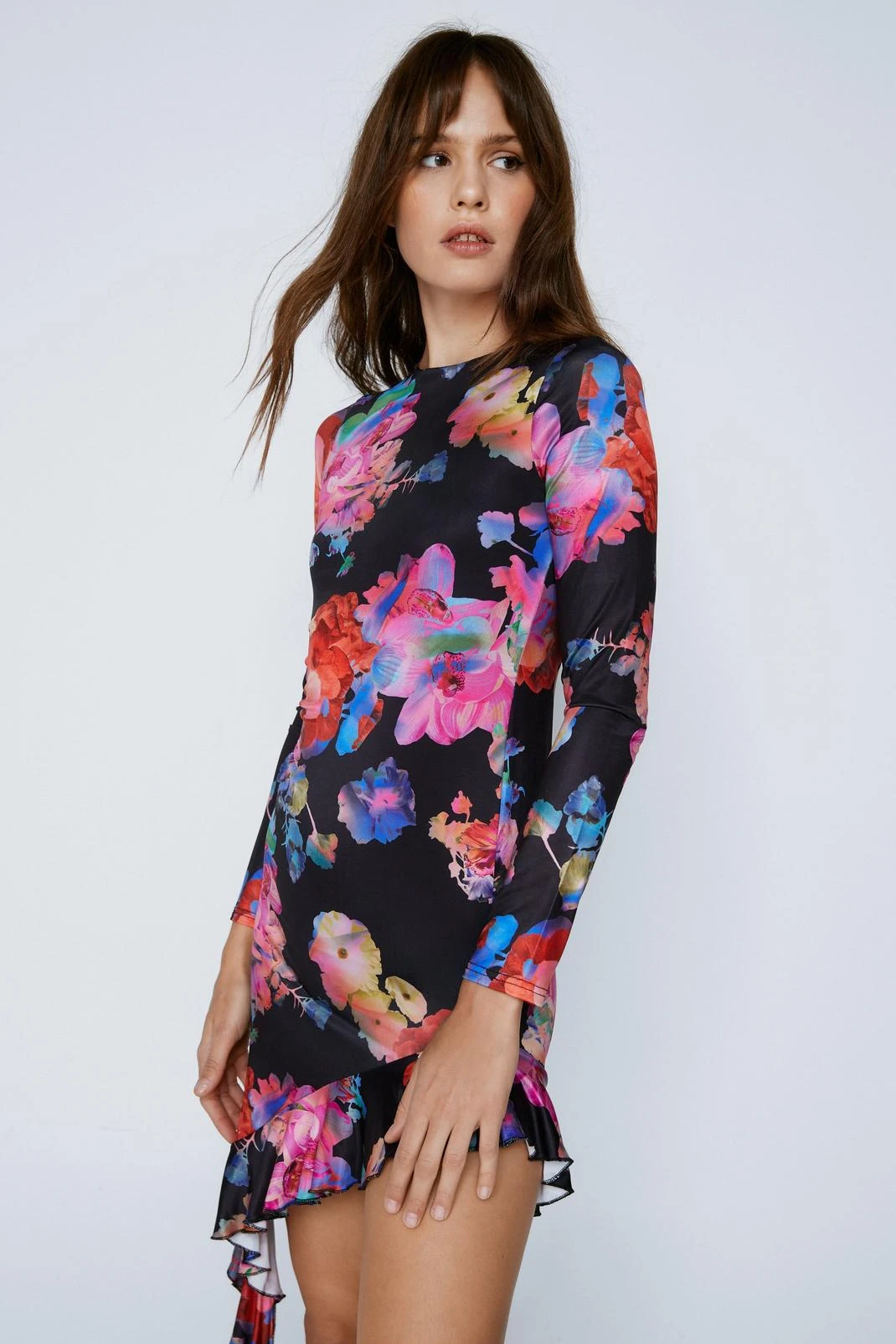 Ruffle it up. Feel feminine and flirty in our asymmetric midi dress, with a ruffle hem and cute floral print. Perfect for wearing year-round, style with strappy heels for a look that will take you anywhere from vacation nights to happy hour with the girls.