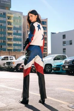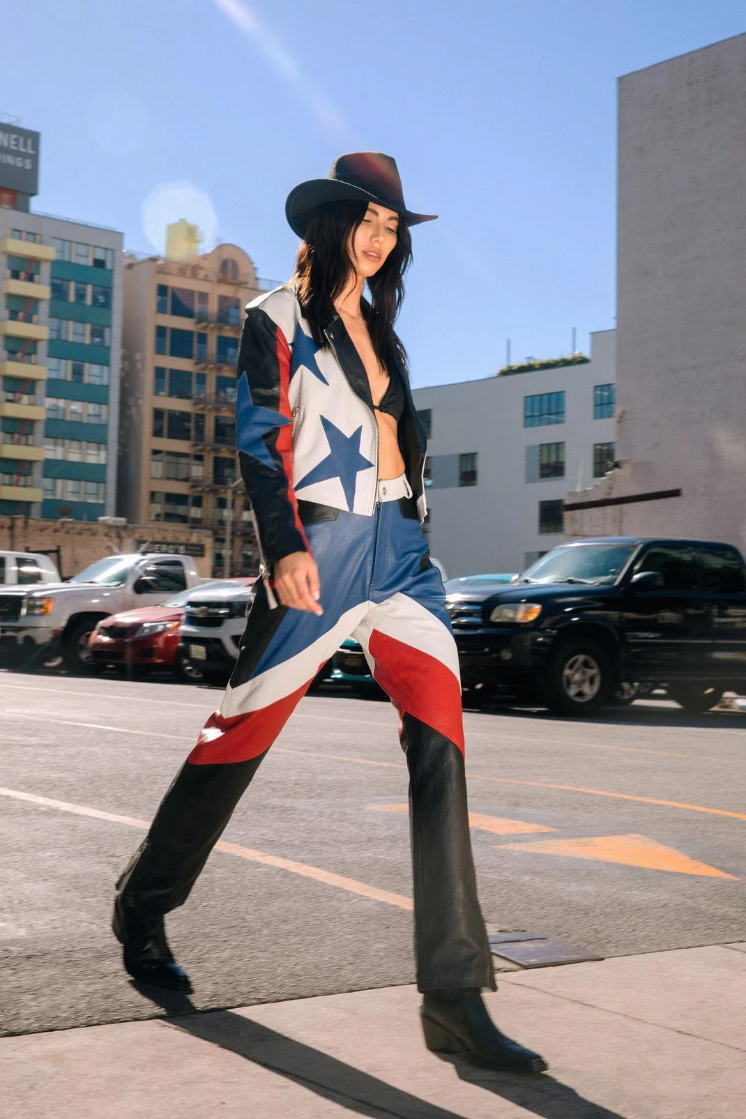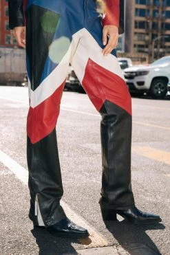 Layer up. Feel edgy in our leather pants, with fun star detailing, colorblock design, and a comfortable straight fit. Pairs well with the matching leather jacket and boots for an elevated day look.