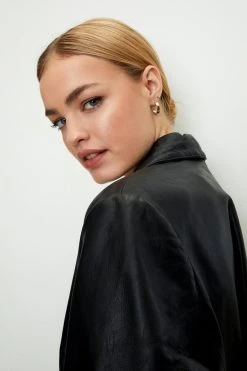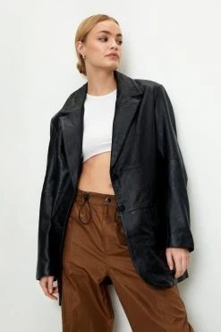 Leather weather. This blazer comes in buttery soft real leather, an iconic closet staple. It features a relaxed, longline silhouette that sits just below the bottom, long sleeves, a V-neckline that draws attention to the face, double breasted lapels, a pointed collar, and button-front closure. Style over jeans and a tee.