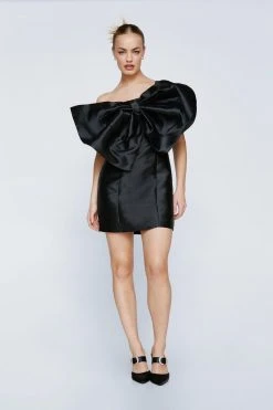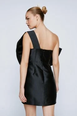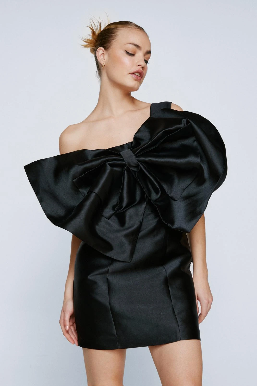 Tied with a bow. Our satin mini cocktail dress features a large bow and one shoulder design for a truly iconic party look.