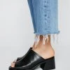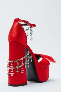 Fancy footwork. Feel fierce in our platform heels, with high quality satin fabric, an extreme chunky platform heel, and unique chain accents. Pairs well with maxi skirts, dresses, and jeans for a look that will take seamlessly from day to night, from happy hours to dinner dates and drinks.