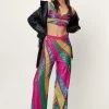 Block it out. Feel luxe in our satin pajama set, with a fun colorblock pattern, a relaxed, oversized shirt, and wide leg shorts. Perfect for lazy days and self care nights.