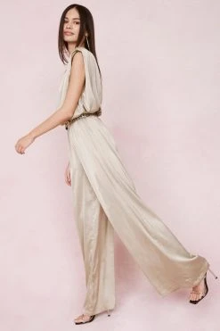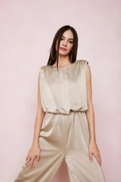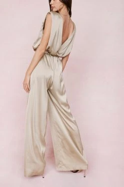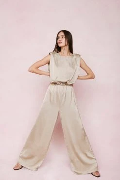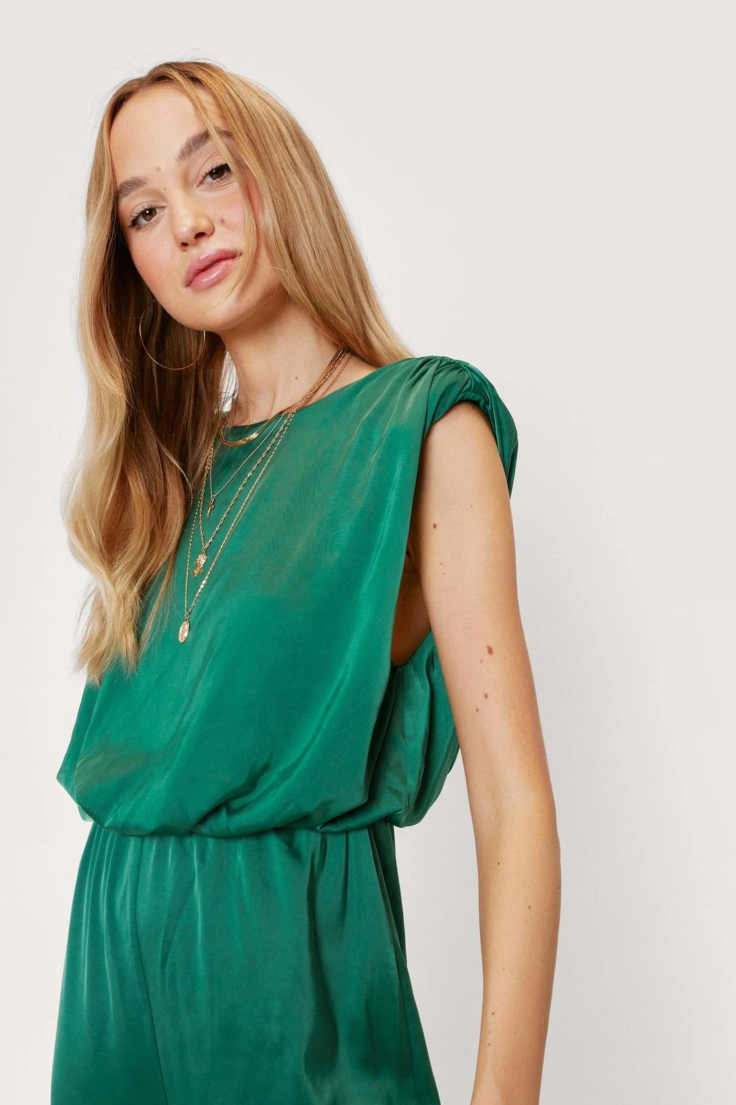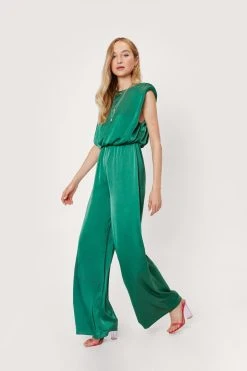 - Style: Satin Shoulder Padded Wide Leg Jumpsuit