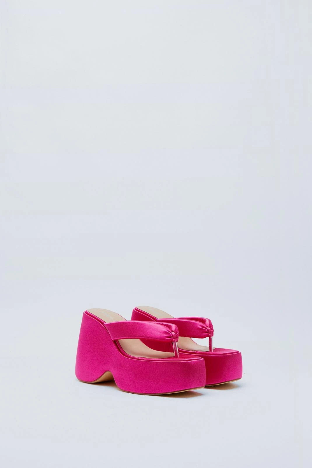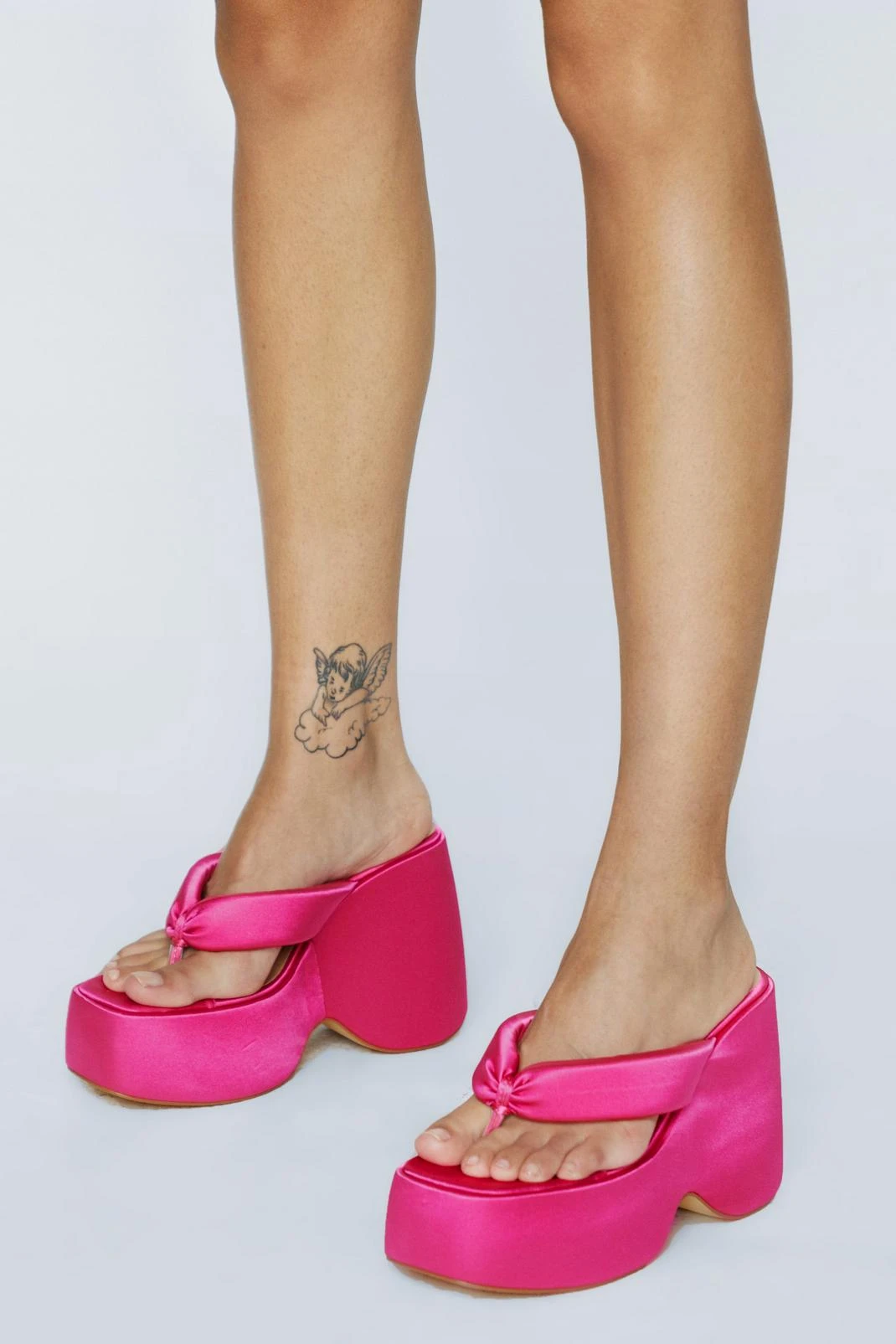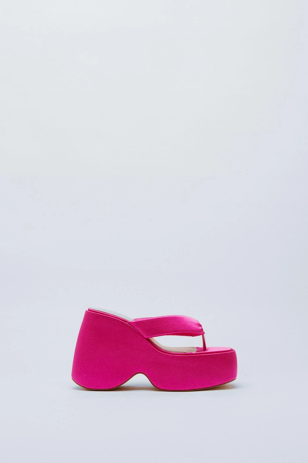 Step it up. Feel like a human doll with our wedge flip flops, made in a high quality satin fabric, with ultra chunky platform soles that are sure to catch eyes and turn heads. Pairs well with mini skirts and dresses for a summery look that you’ll love to come back to.