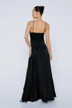 For big entrances and even grander exits. This dress comes in satin and features a relaxed, maxi silhouette, V neckline, wrap design, split at front, gathered detailing, bias cut hem, spaghetti straps, and zip closure at back. Model is 5’8.5″ and wears a US size 6/UK size 1.