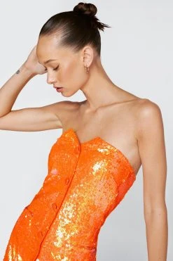 Bright flash. Make an entrance by styling with strappy high heels, and hoop earrings.