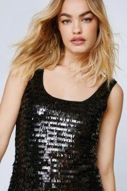 Squared off. Style our sequin mini dress with boots or heels and your fave evening bag.