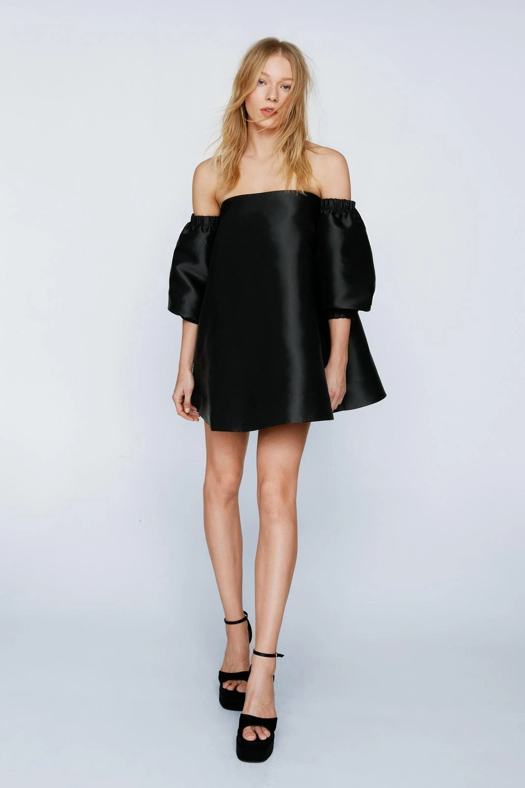 To have and to hold. Feel bridal in your own way in our alternative bridal dress, with a modern bardot neckline, off shoulder sleeves, and a relaxed fit. The mini length offers flirty vibes, while the puff sleeves bring a taste of the traditional to your look. Pairs well with chunky heels.