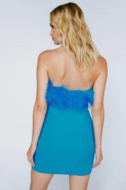 Fly away. Feel femme our mini dress, with a fun feather trim, a straight neckline, and a flattering bodycon fit. Pairs well with chunky heels and boots for a night out look you’ll keep coming back to, perfect for happy hours and nearby dancefloors.
