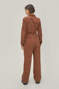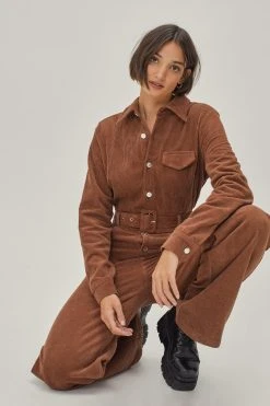 One and done kinda thing. This premium jumpsuit comes in a thick, soft corduroy and features a relaxed, wideleg silhouette, contrasting button fastenings, a matching buckle belt with belt loops, utility style pockets, and full length, cuffed sleeves. Style with biker boots and some chunky jewelry.