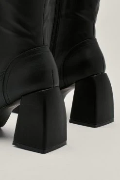 Must be the season of the shoe. These wide fit boots come in flexible faux leather and feature a knee high design, square toe, platform sole, chunky block heel, and inside zip closure. Live in blissful matrimony with cable knit sweaters and A Line skirts.