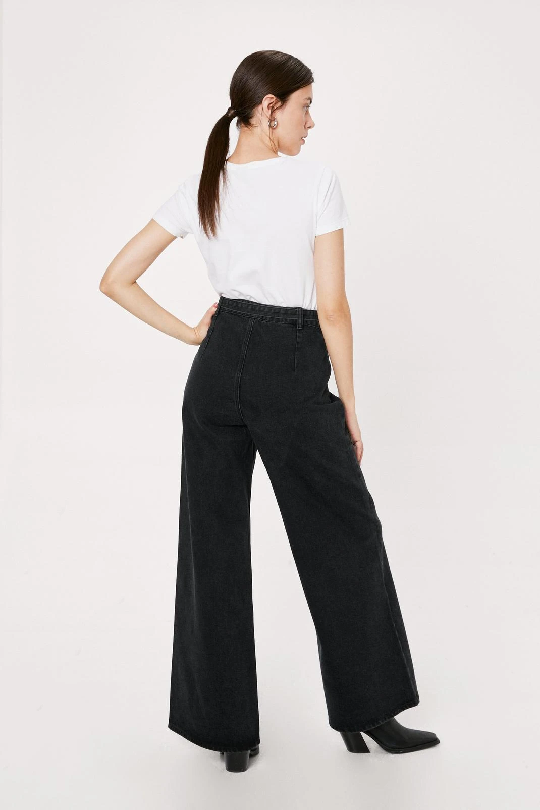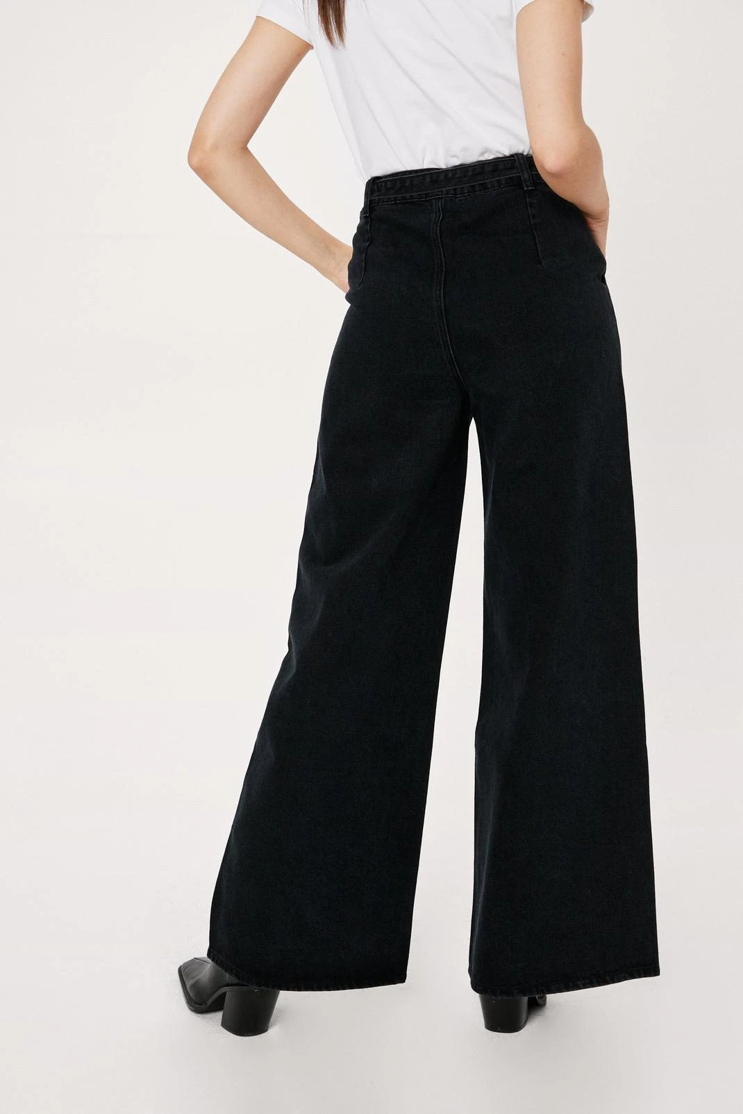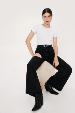 For denim disciples. These denim jeans come in breathable cotton and feature a high waistband with belt loops, detachable western-inspired belt with metal eyelets, super wide leg design, and faded detailing at back. Wear yours dancing with pointed platform boots and cropped cami tops.